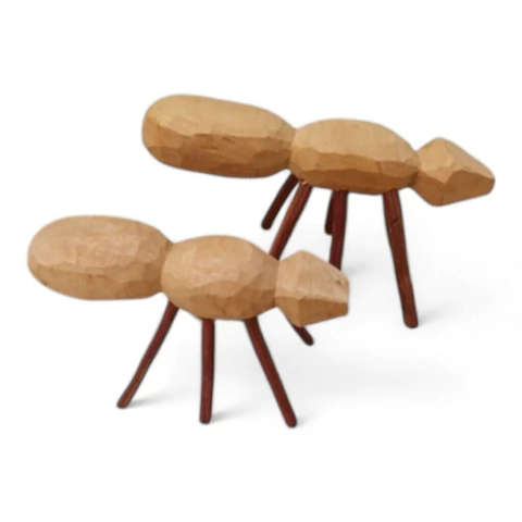 Esculturas talhadas em madeira que representam formigas em traços simples e rústicos. Cada peça celebra a criatividade popular do Vale do Catimbau, transformando o cotidiano em arte, com humor e delicadeza.